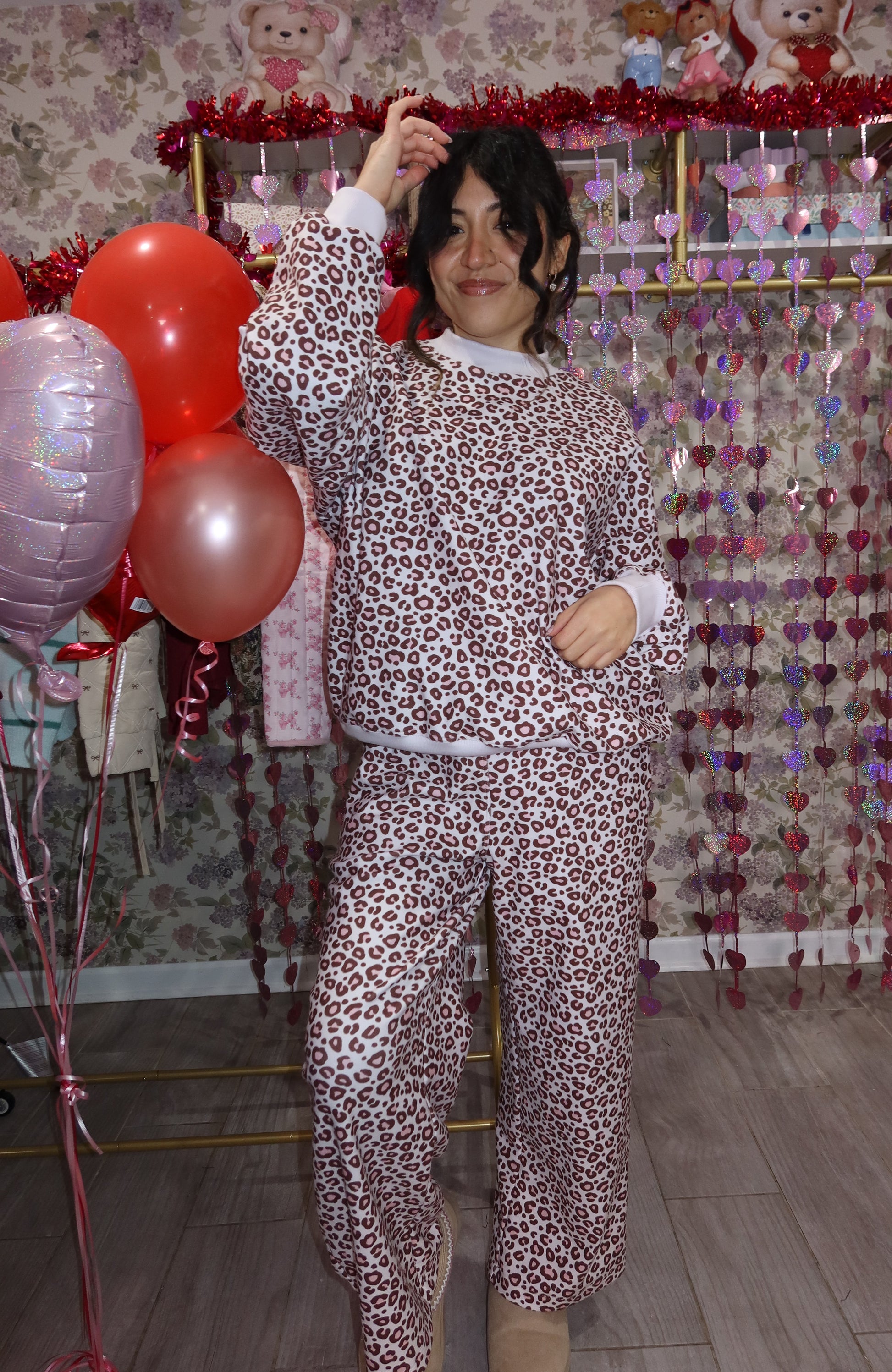 A cozy lounge set with a playful twist. Featuring a soft leopard print in dreamy pink tones, this set includes a relaxed long-sleeve top and matching wide-leg pants for an effortlessly comfy fit. Perfect for lounging at home or stepping out in style, this set is equal parts cute, cozy, and confident.